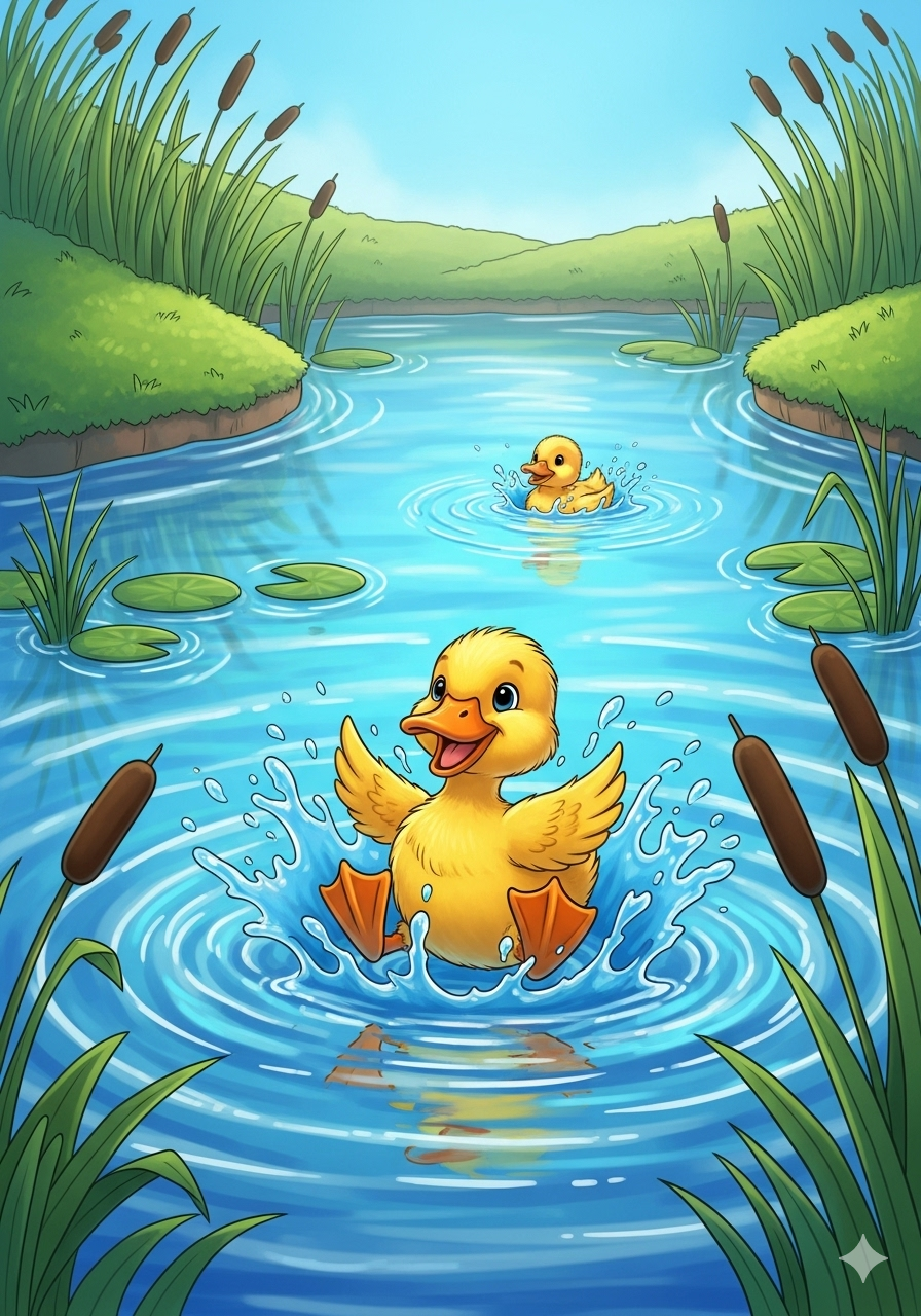 Danny the duck loved his pond. All day long, he would SPLISH! SPLASH! and SPOOSH! making big, happy waves.