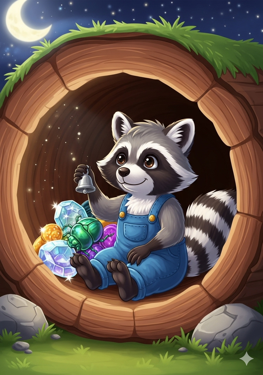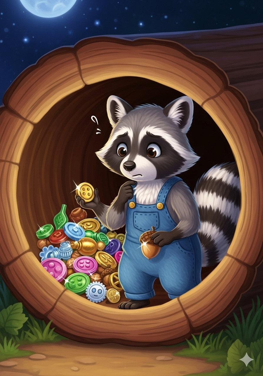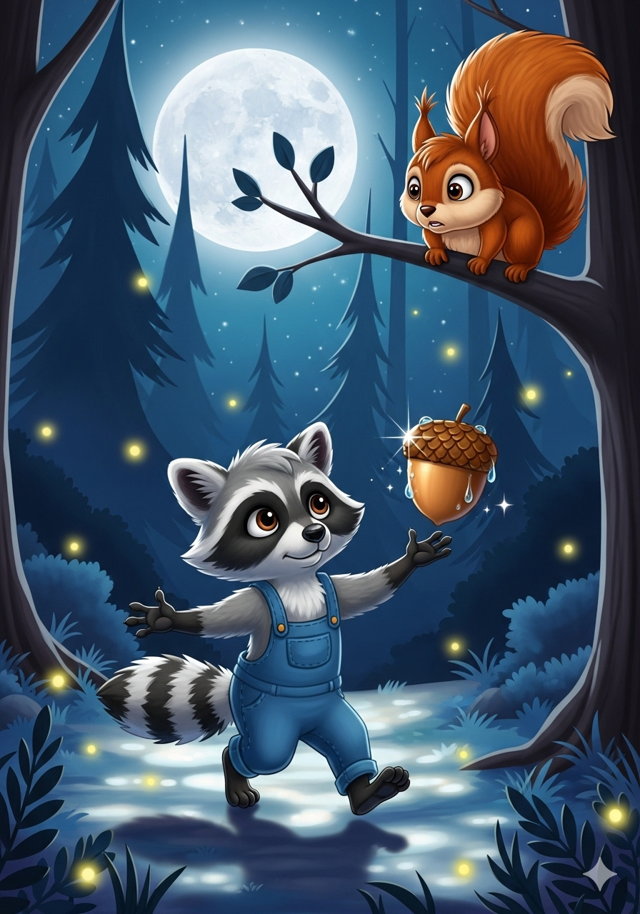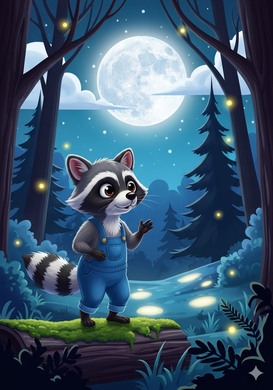 Rico the raccoon loved shiny things more than anything. Every night, under the silvery moon, he would sneak through the forest, his eyes searching for treasure.