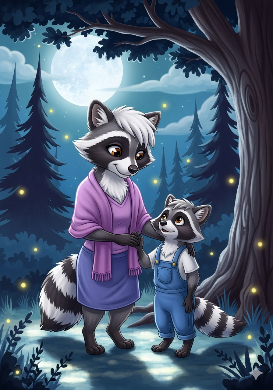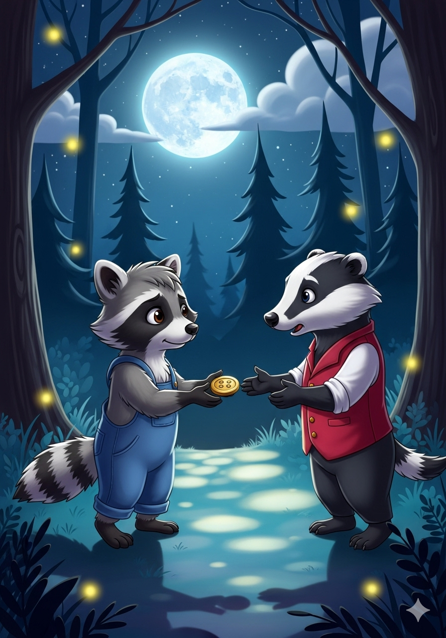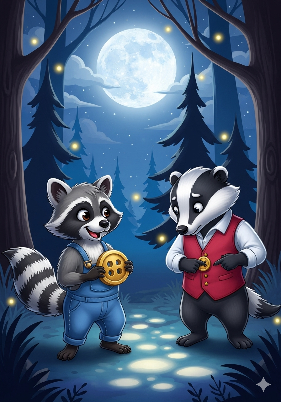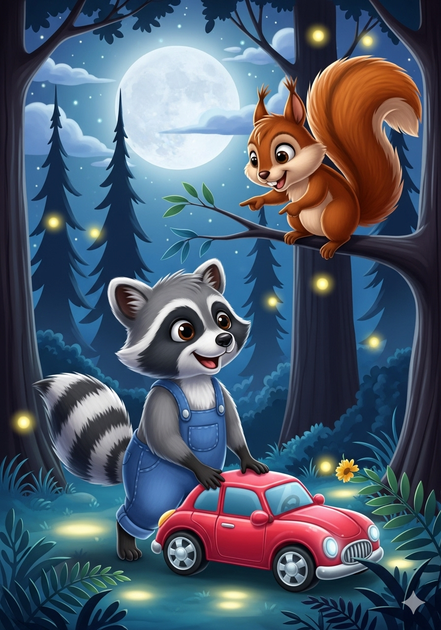 Rico the raccoon loved shiny things more than anything. Every night, under the silvery moon, he would sneak through the forest, his eyes searching for treasure.