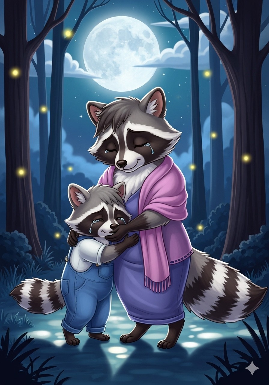 Mama Raccoon hugged him tight. “I know it hurts to lose something you love,” she said softly. “Perhaps this is how Barnaby felt when he lost his shiny button.”