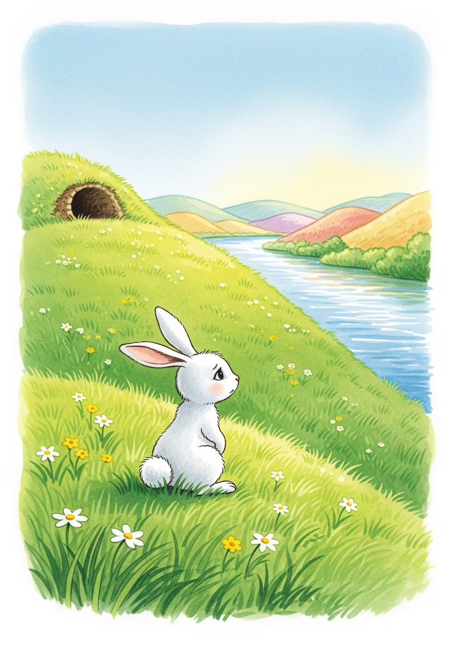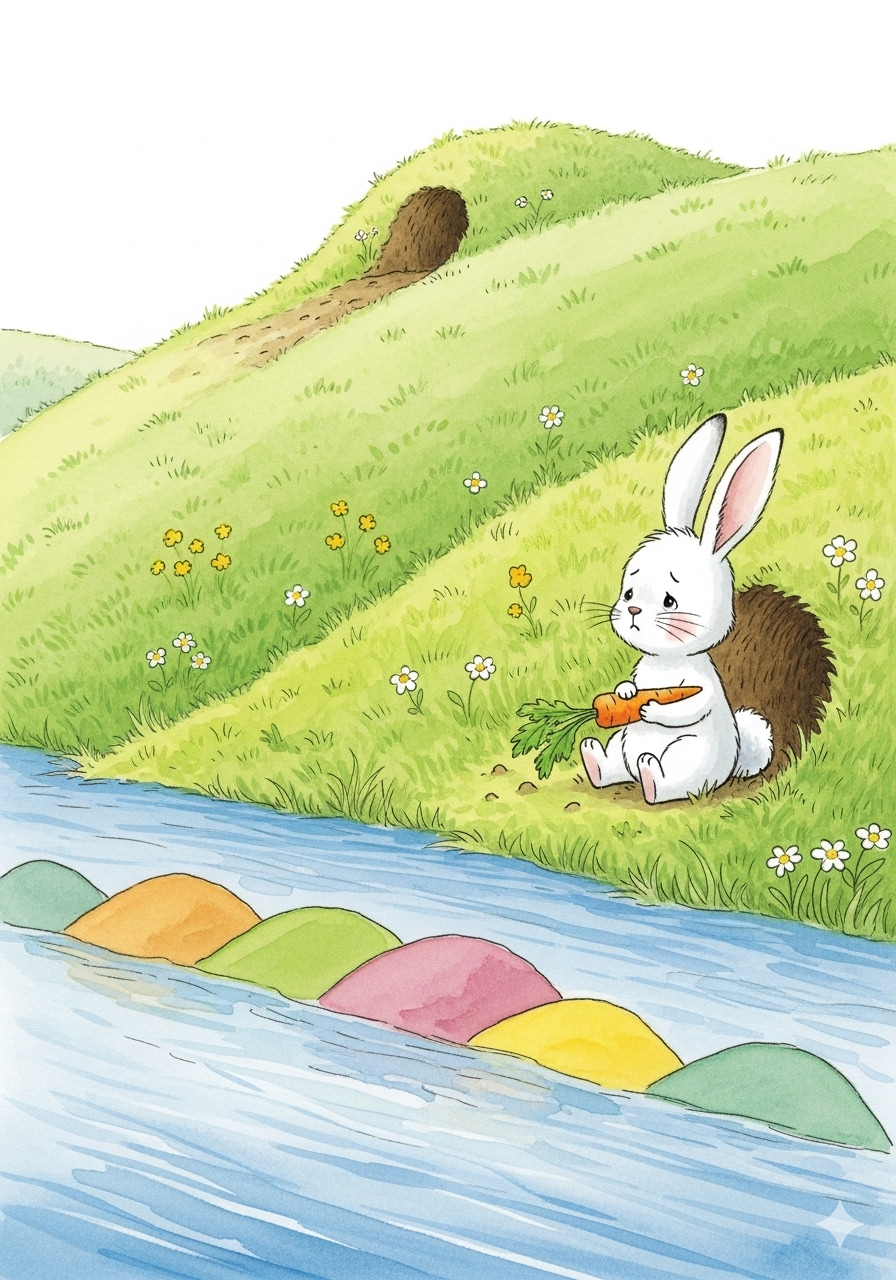 Little rabbit Pipkin lived on a grassy hill. Across a wide, blue river, his friends lived on their own hills. Pipkin wanted to play, but the river was too big to cross.