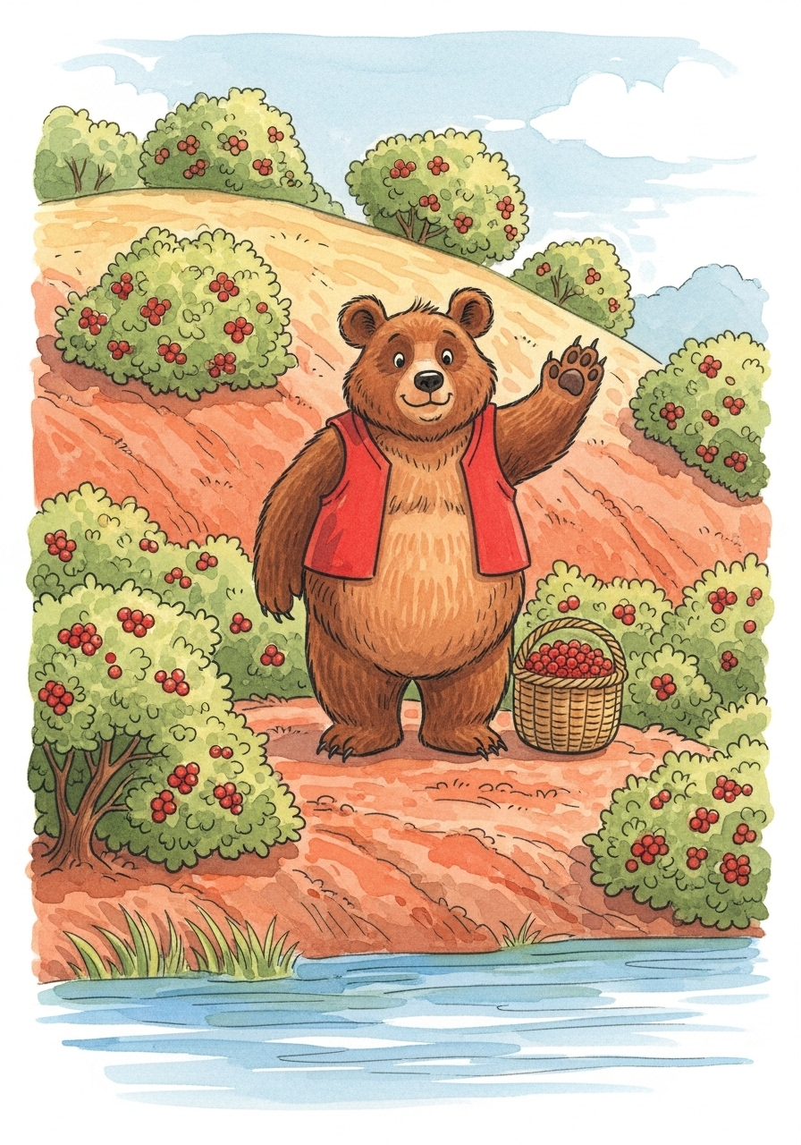 On the red hill lived Bruno the bear with his yummy red berries. “Hello, Pipkin!” he waved.