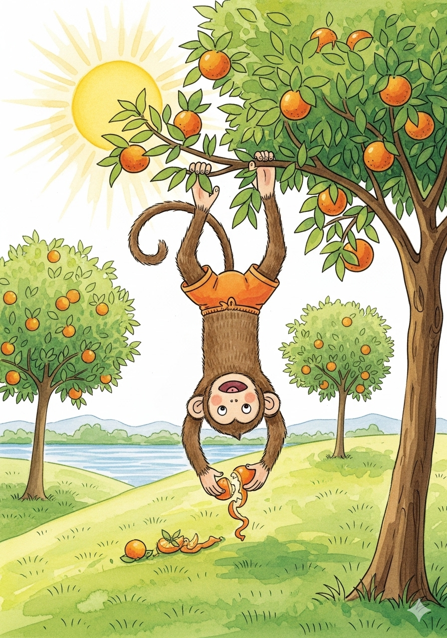 On the orange hill lived Zippy the monkey with his sweet, orange oranges. “Yoo-hoo, Pipkin!” he chattered.