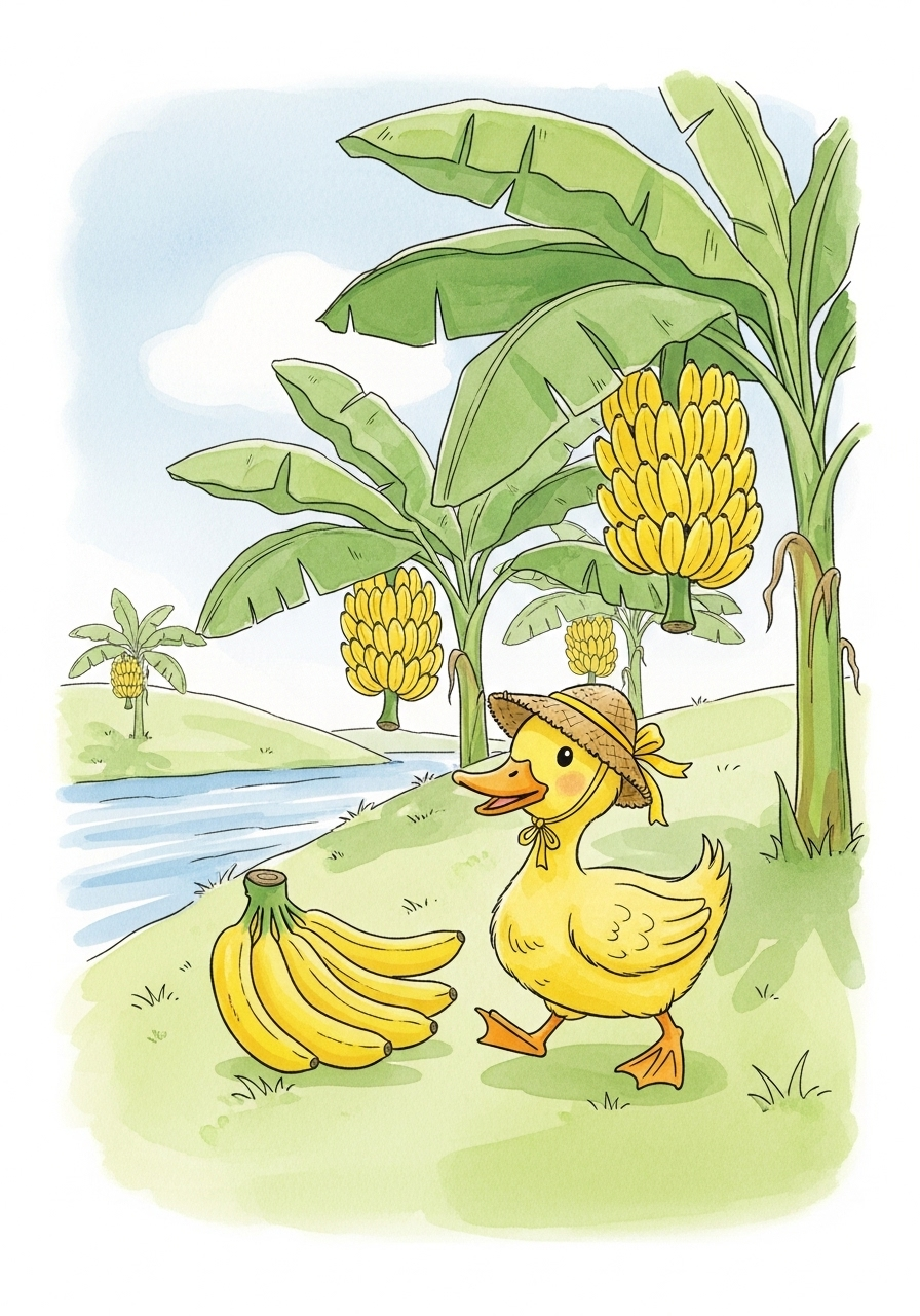 And on the yellow hill lived Dilly the duck with her bright, yellow bananas. “Quack, hello!” she called.