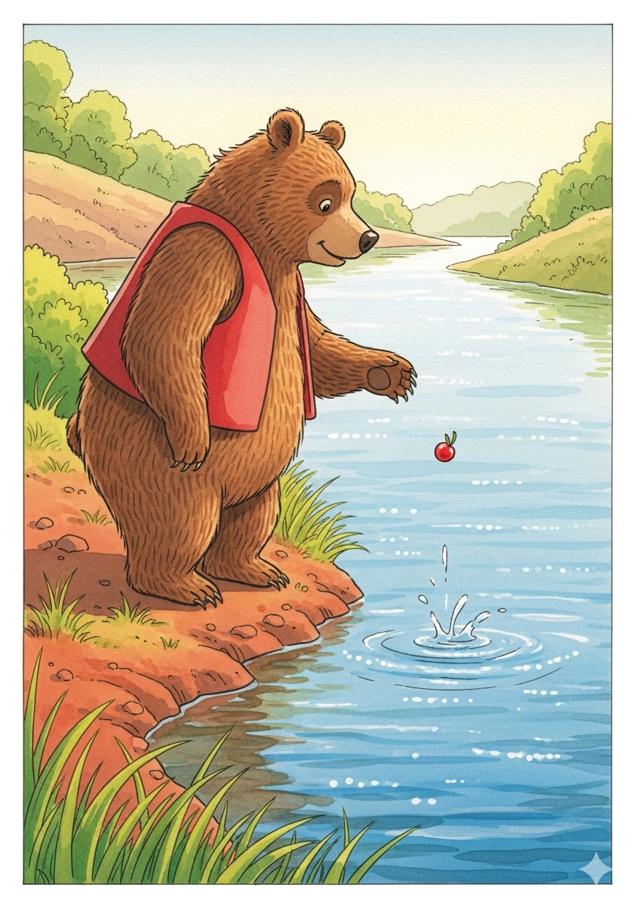 Seeing his friend was sad, Bruno the bear had an idea. He took one of his reddest berries and tossed it into the river. Plink! It floated in the water, a little red dot.
