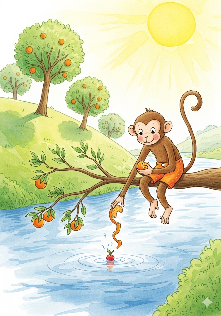 Zippy the monkey saw what Bruno did. He peeled an orange and dropped a piece in the water. Plop! It floated next to the berry.