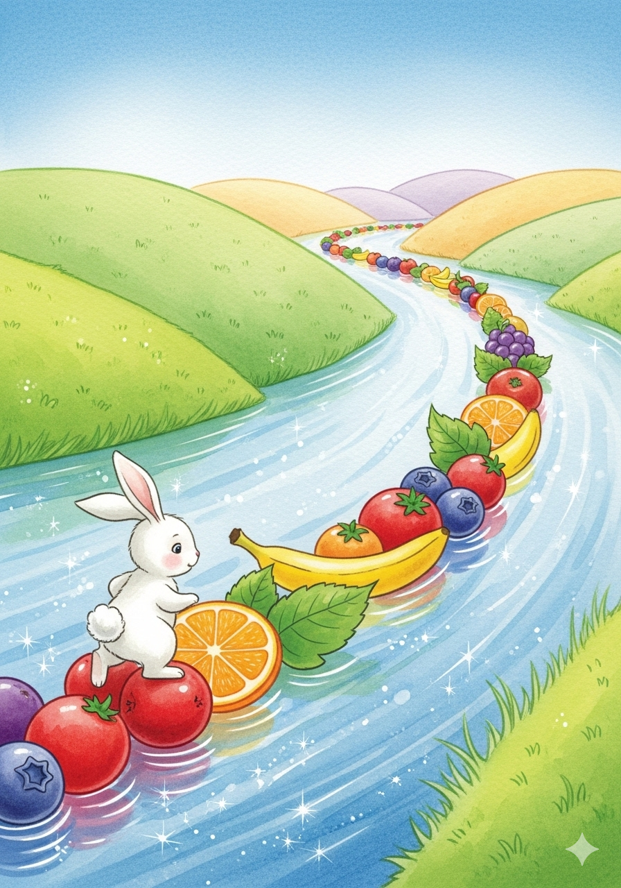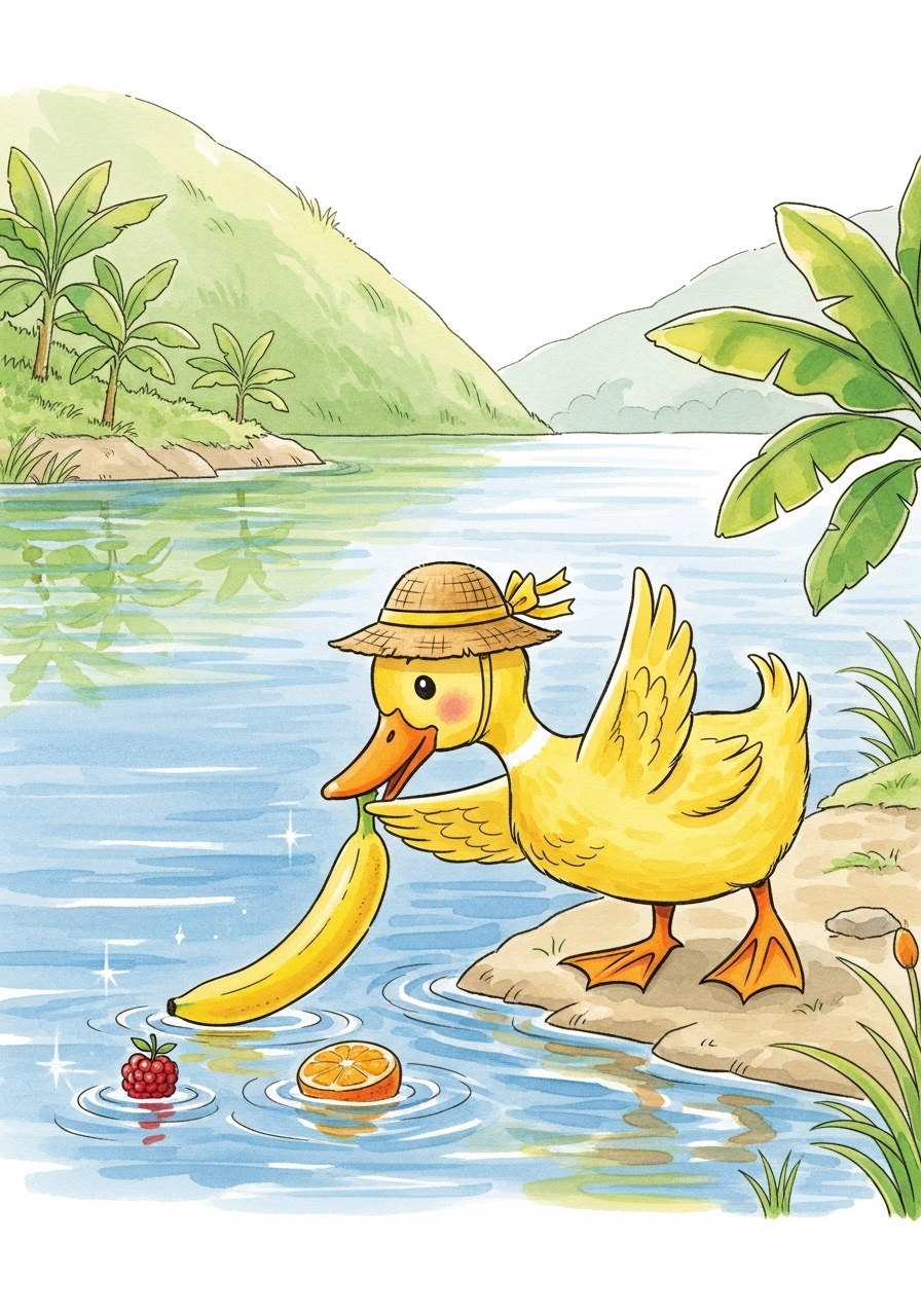 Dilly the duck understood! She pushed a yellow banana into the river. Splash! Soon, more and more friends joined in, sharing their colorful foods.